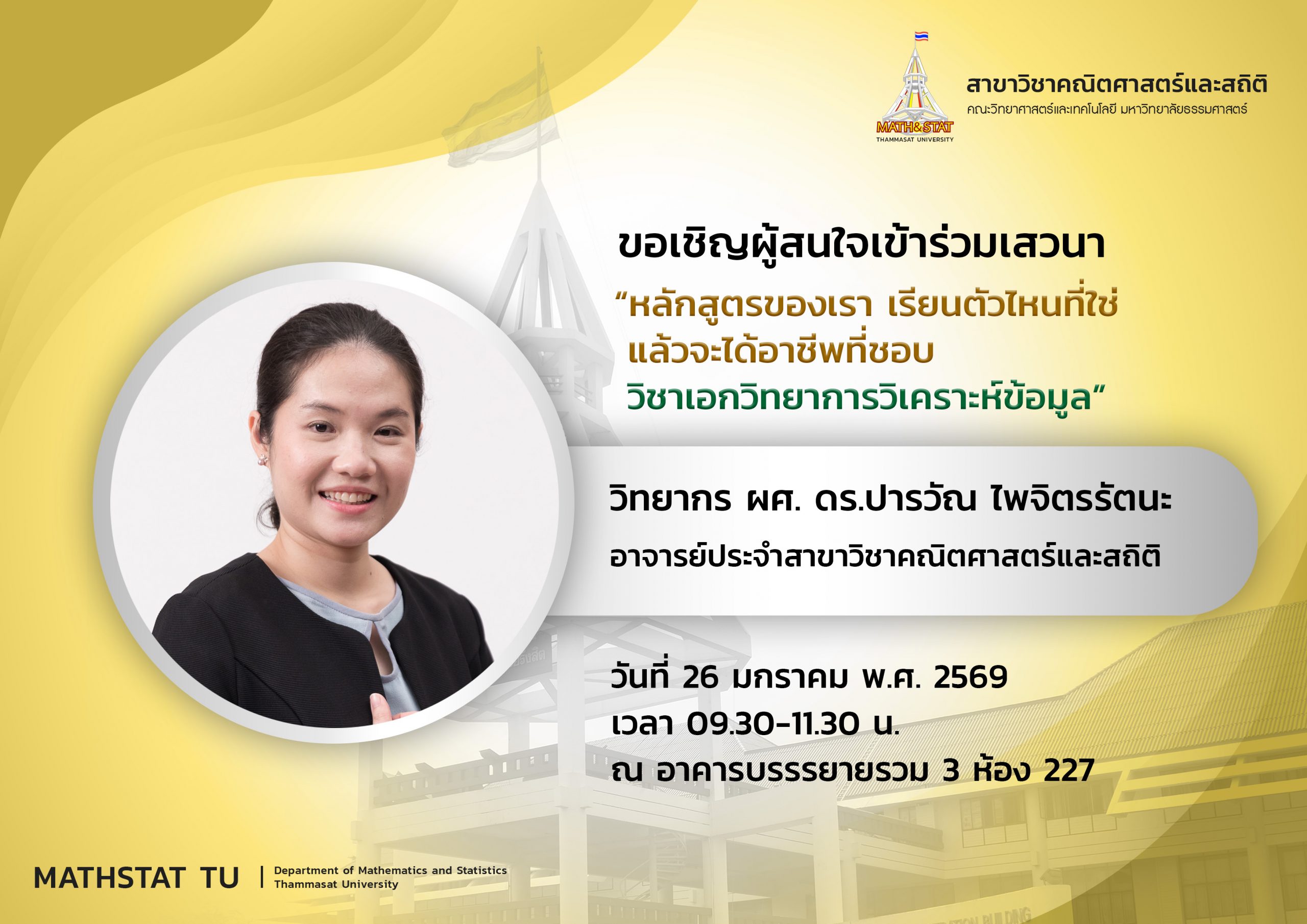 “โครงการแนะแนวทางด้านผลการเรียนของนักศึกษาสาขาสถิติ โครงการปริญญาตรีภาคพิเศษ ” วันที่ 13 มกราคม 2569 เวลา 16.30-17.30 น. ณ อาคารบรรยายรวม 3 ห้อง 227