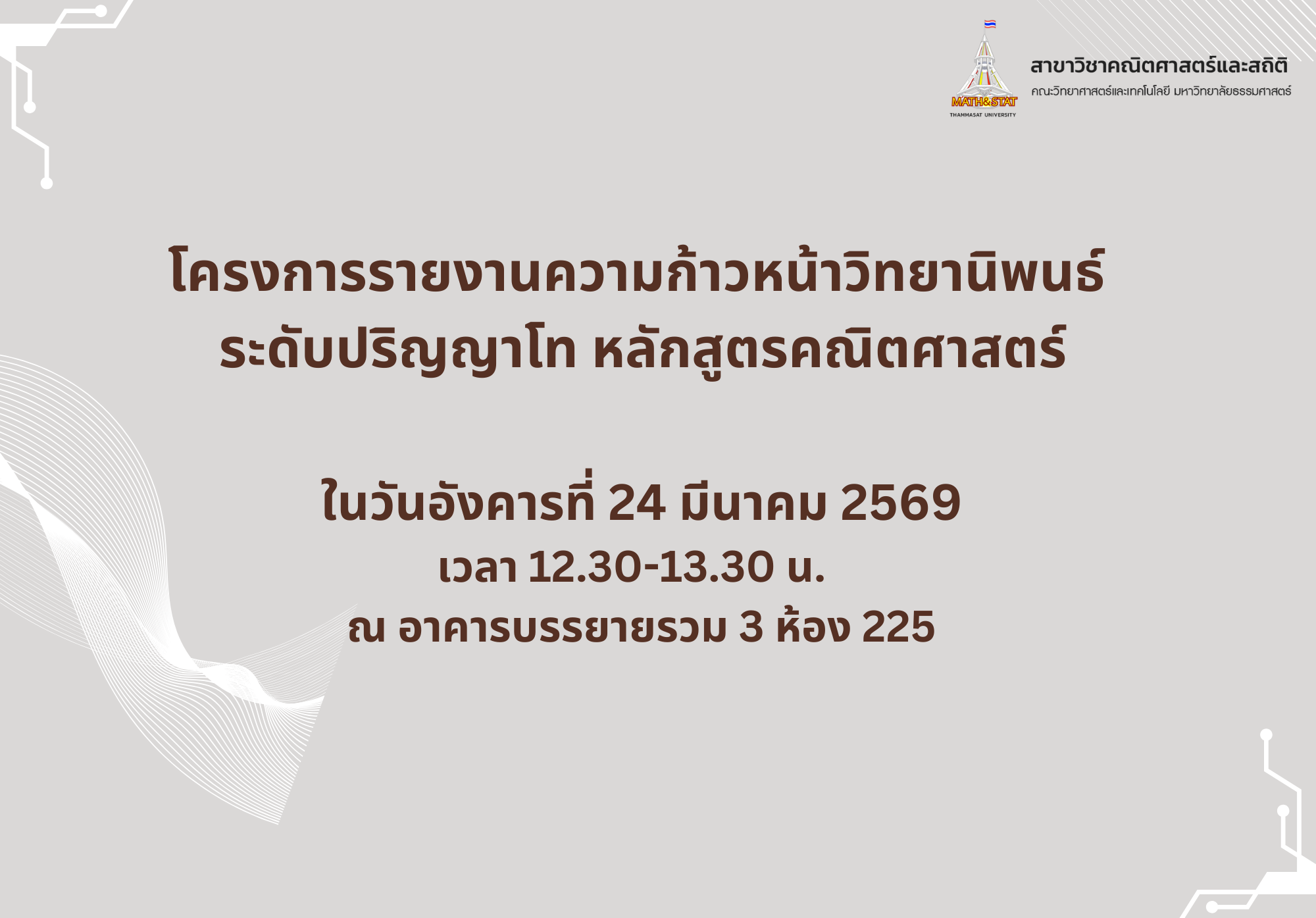 การรายงานความก้าวหน้าวิทยานิพนธ์ ระดับปริญญาโท หลักสูตรคณิตศาสตร์ วันที่ 24 มีนาคม 2569 เวลา 12.30 – 13.30 น. ห้อง บรรยายรวม 3-225