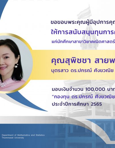 - หลักเกณฑ์การให้ทุนเรียนดี กองทุน ดร.ปกรณ์ ศังขวณิช สำหรับนักศึกษาระดับปริญญาตรี สาขาวิชาคณิตศาสตร์และสถิติ คณะวิทยาศาสตร์และเทคโนโลยี มหาวิทยาลัยธรรมศาสตร์ ผู้มีผลการเรียนยอดเยี่ยมเฉพาะวิชา ปีการศึกษา 2566