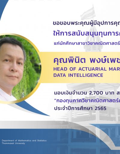 - ขอเชิญร่วมบริจาคทุนการศึกษา สมทบเข้ากองทุนภาควิชาคณิตศาสตร์และสถิติ “ร่วมสร้างอนาคตที่สดใสให้กับนักศึกษา พร้อมรับสิทธิ์ประโยชน์ทางภาษีจากการบริจาคของคุณ”