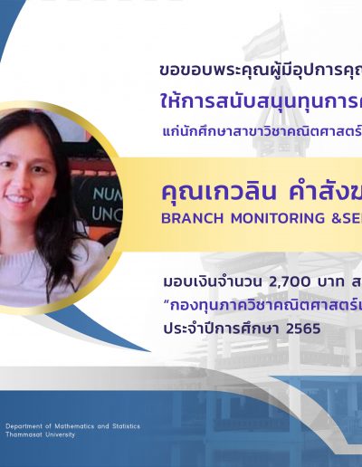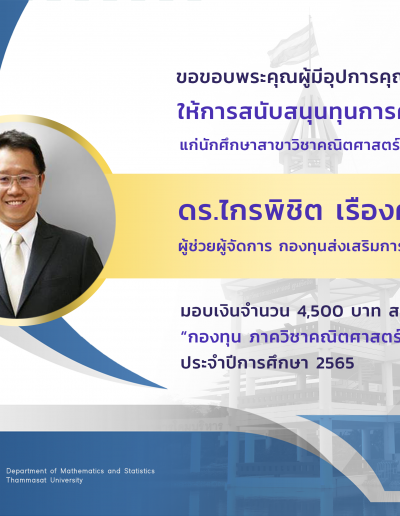 - ประกาศ รับสมัครนักศึกษาเพื่อขอรับทุนขาดแคลนทุนทรัพย์ กองทุนภาควิชาคณิตศาสตร์และสถิติ สำหรับปีการศึกษา 2565